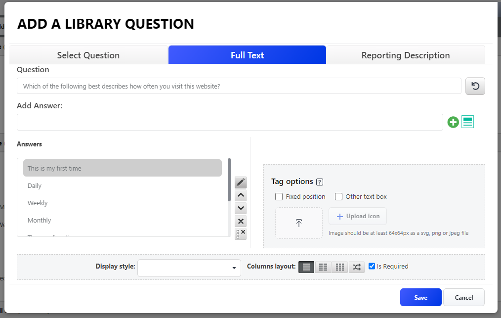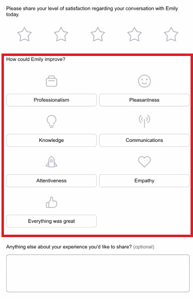 On single-select and multi-select survey questions, we have added the ability to display a custom icon or small image files for answer tags. This allows you to customize the answers tags according to your brand. When you use Survey Builder to add or edit a question and choose either the Single-select or Multi Select > Custom question type, you can add custom icons or upload your brand’s image files for each answer tag. Below is an example of icons being used with survey answer options.