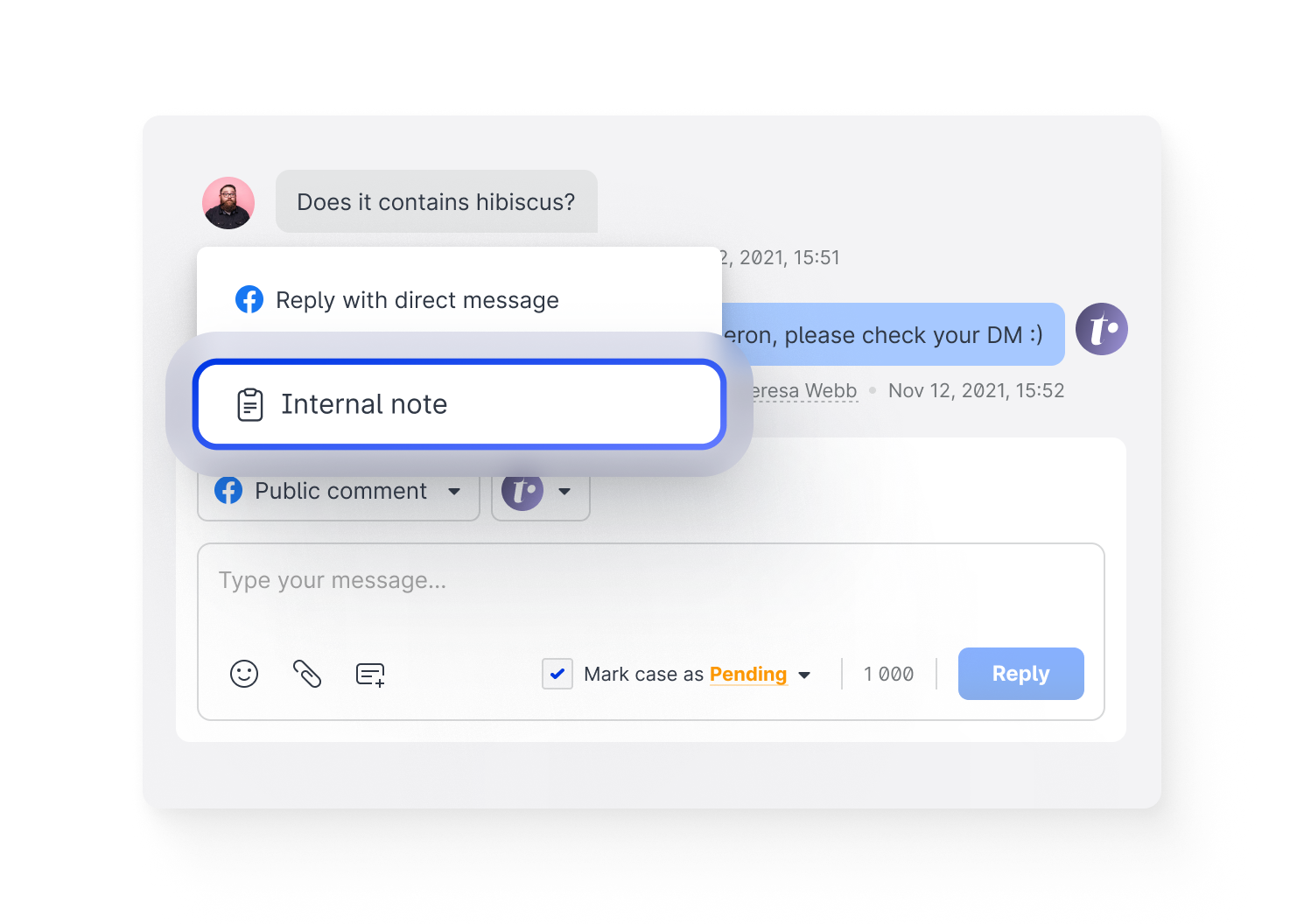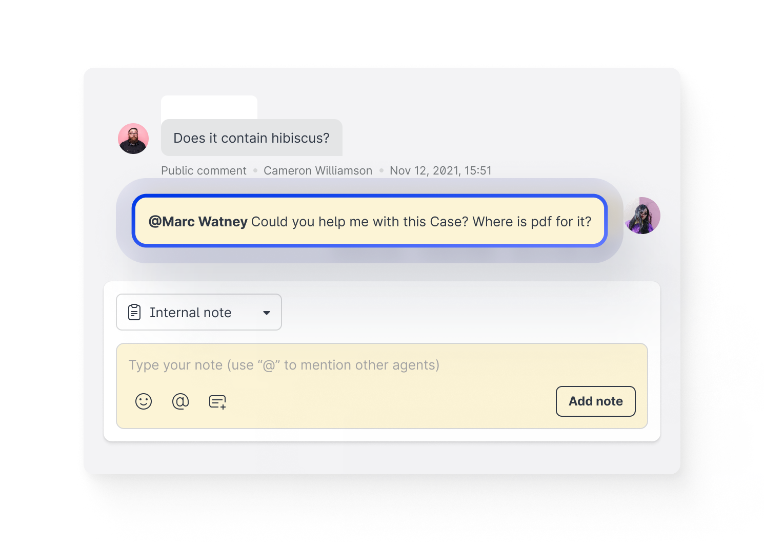 In Care, you can now add an internal note to a case with information about the case or tagging another Care user.
