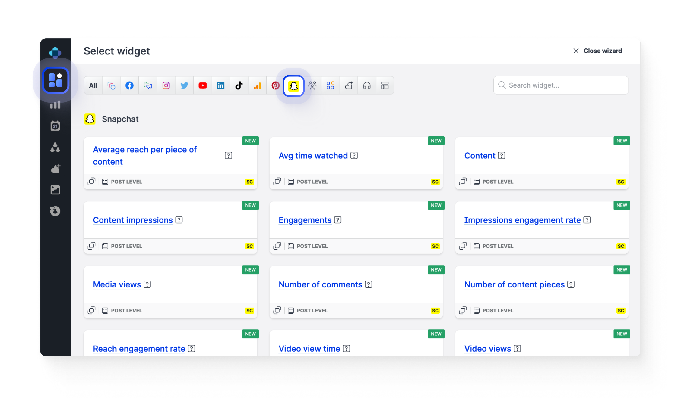 All these widgets work across multiple platforms (for example, in addition to the newly added Snapchat, Content impressions supports Facebook, Instagram, Twitter, LinkedIn, and TikTok). You can use any of these widgets to compare data from several different platforms.