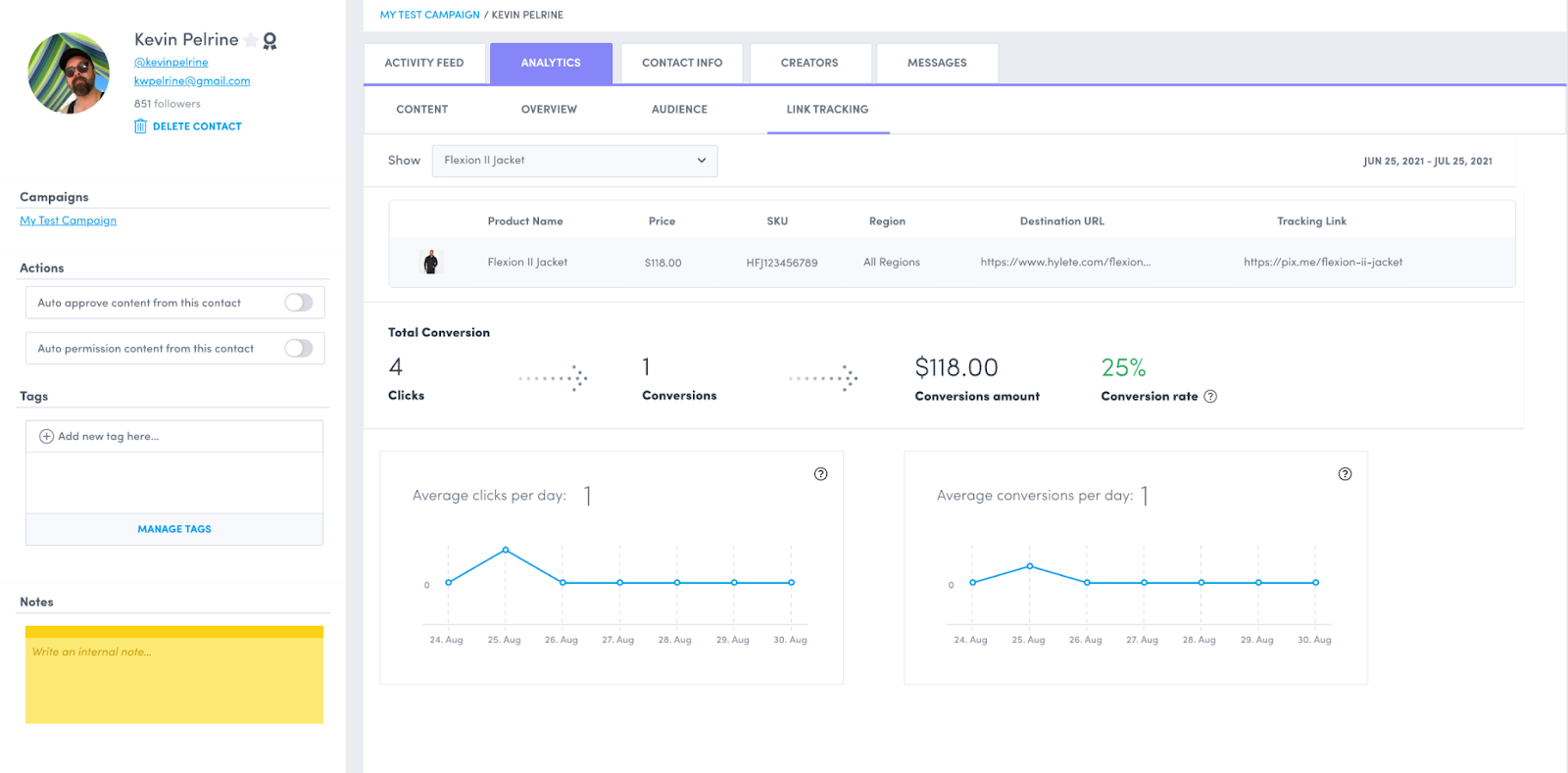 Each tracking link given to your creators will track link clicks, conversions & conversion $