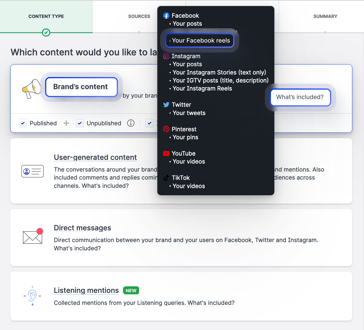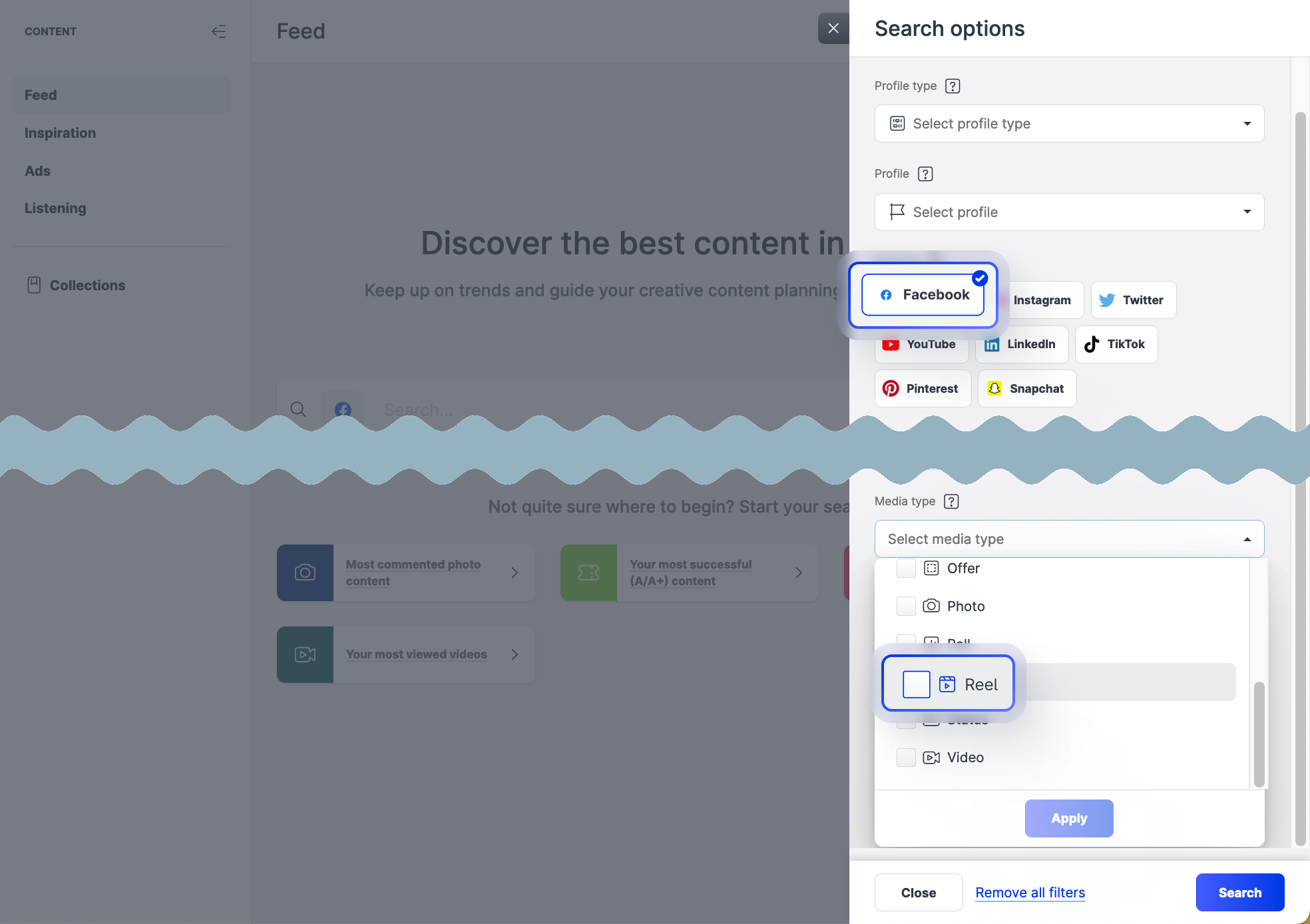 In the Content module, you can now choose reels as a filter option when filtering Facebook content by media type.