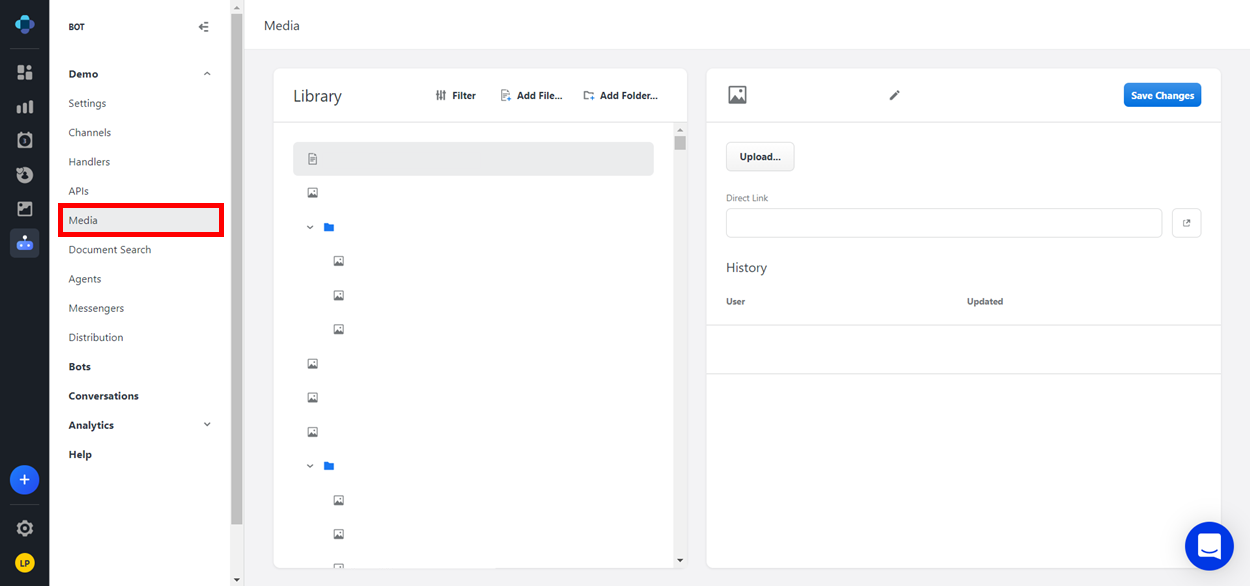 The Media page is where you can upload, store, and organize custom media files to use when configuring your bots. This allows you to reuse relevant content in multiples bots without having to upload it multiple times.