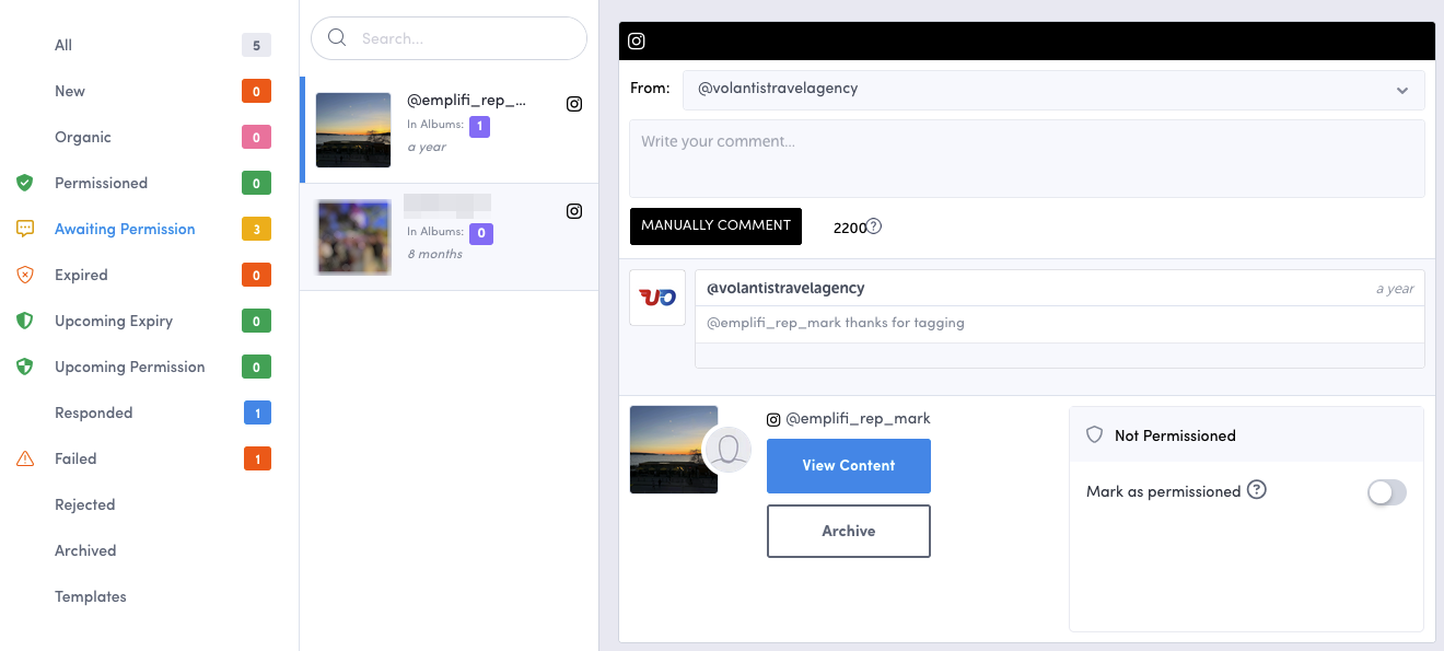 View the comments you’ve exchanged with creators about the permission to use their content. To learn more, see Send Permission Requests.