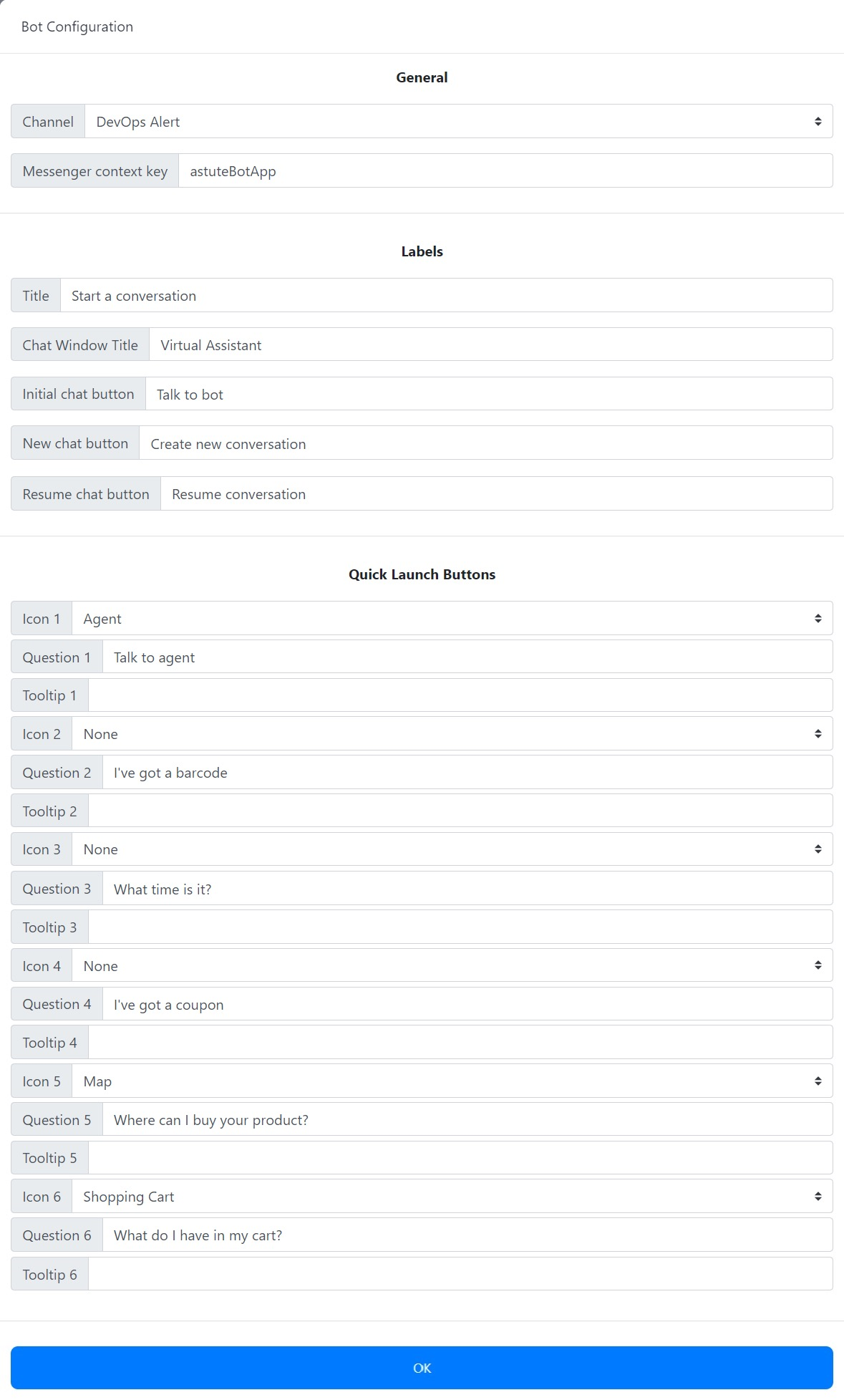 Channel: Use the drop-down to select the bot webchat channel that will be displayed when a user starts a conversation with the bot.