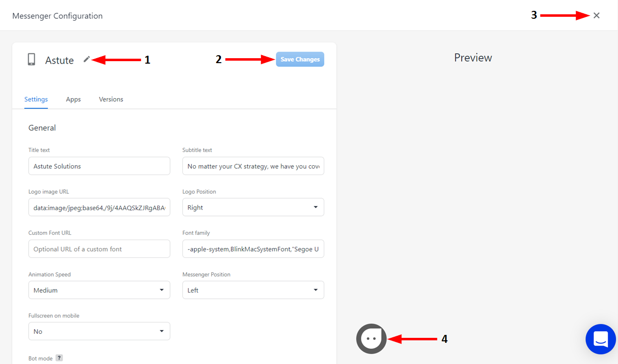 3 | Exit | Click here to close the Messenger Configuration window and return to the Messengers page. If you have made any unsaved changes to your Messenger, a dialog window prompting you to save your changes will open. |