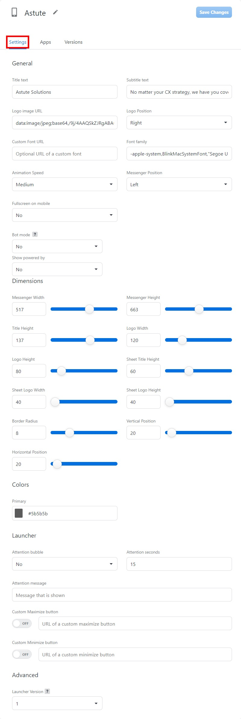 The Settings tab allows you to manage the style of your messenger. It contains five sections: General, Dimensions, Colors, Launcher, and Advanced. When you are finished configuring your messenger settings, click the Save button.