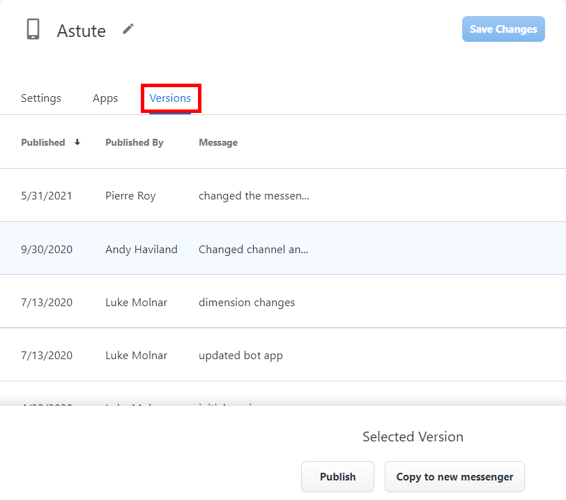 The Version tab shows you a history of previously published version of the messenger, alongside messages detailing the specific changes that were made to each version.