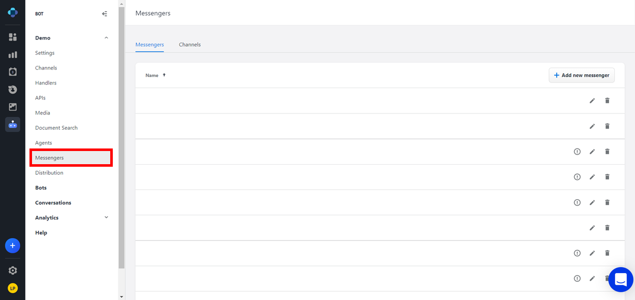 The Messengers tab displays a list of your company's messengers. Here, you can configure each messenger that will be placed on your website.