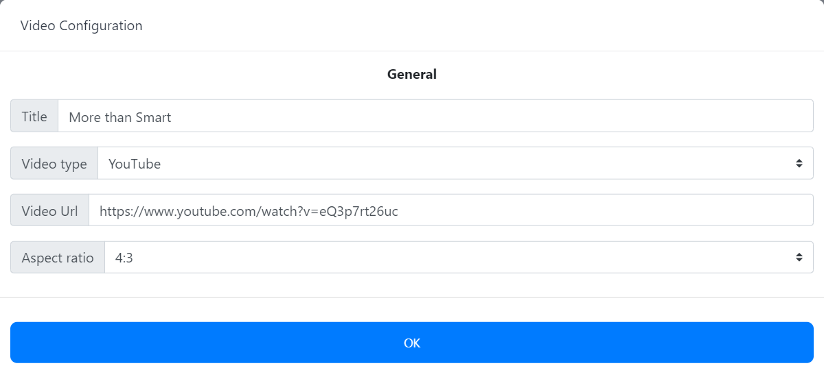On the Video app, click the Configure App button to open the Video Configuration window.