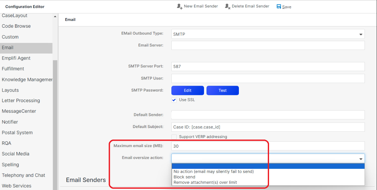 The Email oversize action setting is used for automated emails (such as Notifications triggered by an Action). Messages and Notifications that are sent manually provide users with a warning and allow the user to adjust the included attachment(s).