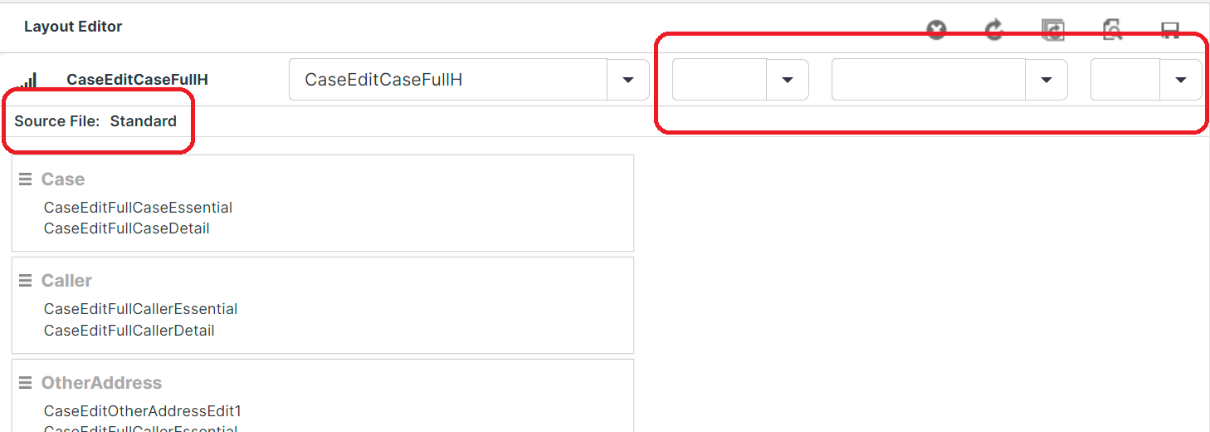 Example, if the CaseEditCaseFullH has been edited for the SYS Company and users in the DEFAULT configuration, then the Source File will be LayoutListCSYSGDEFAULT. If the layout has not been modified at any level, it will be Standard.