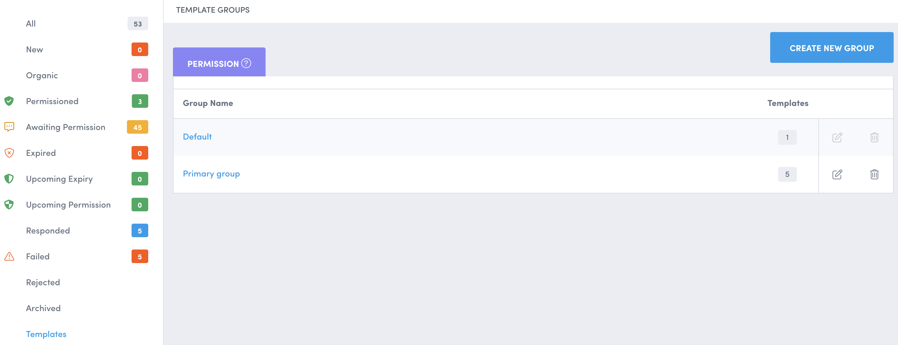 By default, each account comes with a Default template group that cannot be deleted. All other groups can be deleted.