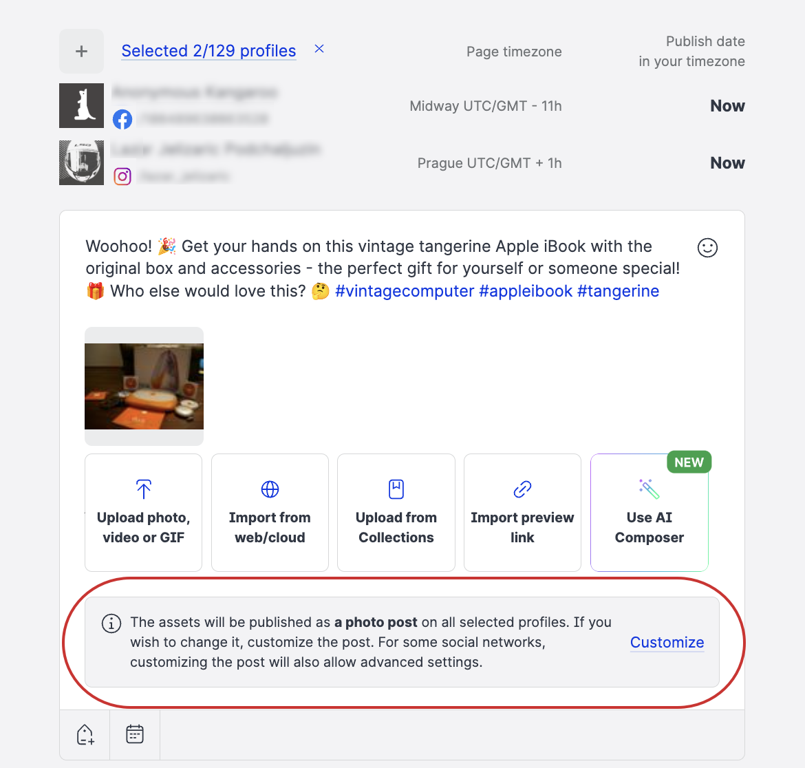 Note the Customize section that appears when you select multiple platforms for your multipost.