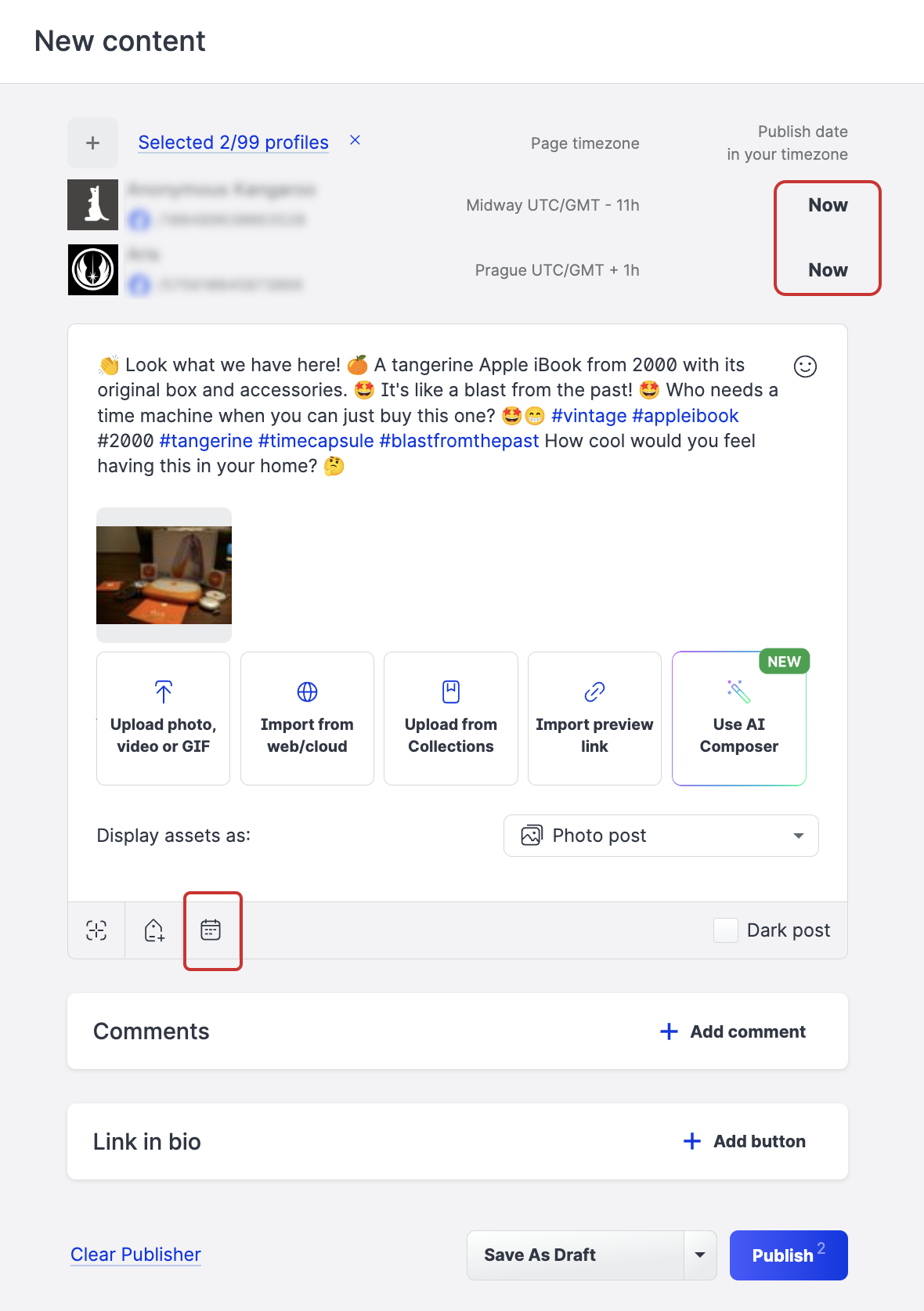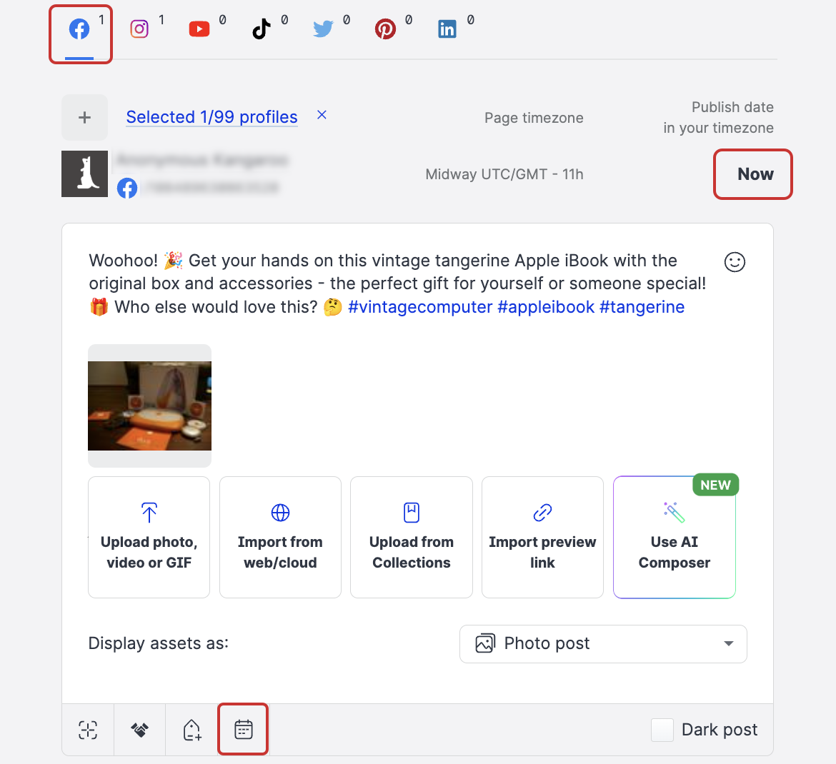 The process for creating and scheduling posts to multiple profiles over multiple platforms is very similar to a single platform procedure. However, multiposting to several platforms gives you further options to schedule different dates and times for each platform.