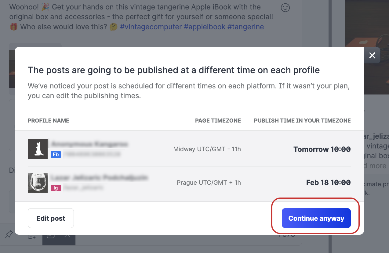 Click Continue anyway or click Edit post to change the schedule.