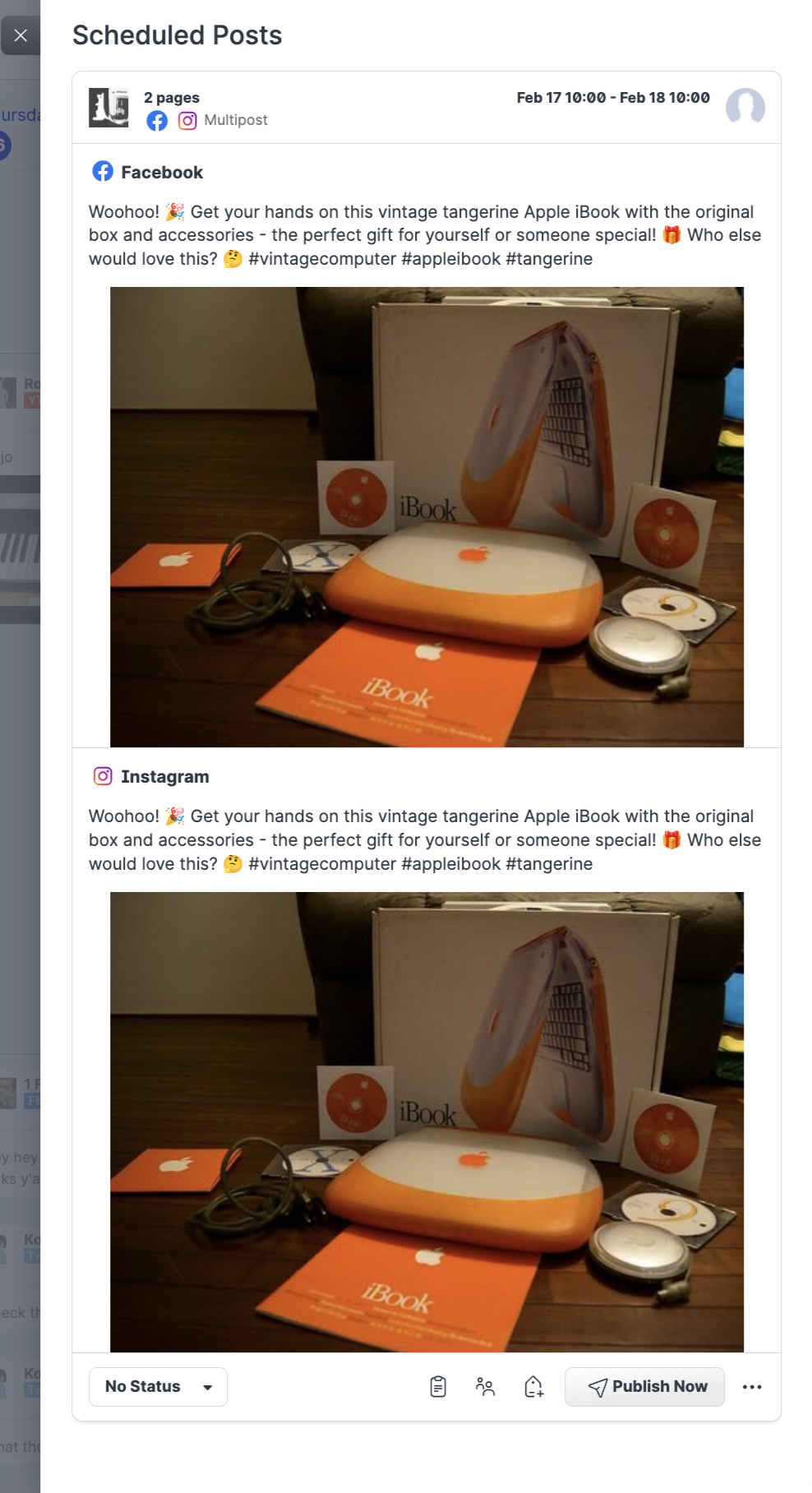 Repeat steps 8 and 9 for every platform.After you schedule all the multipost across all platforms, Click Publish.