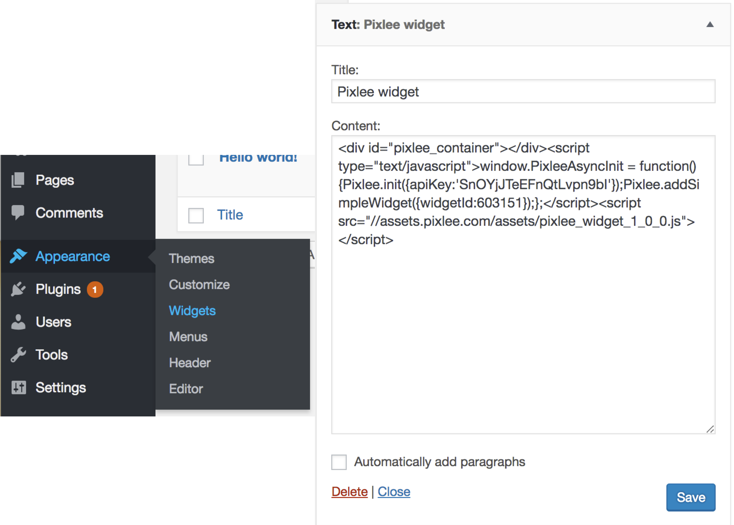 In the side menu, click into the Appearance to access your Widgets.