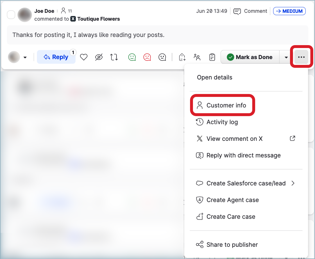 Depending on whether the profile on whose behalf you communicate with the customer and the content of the Community message (like, reply, and so on) has been selected for the Community message, do one of the following: