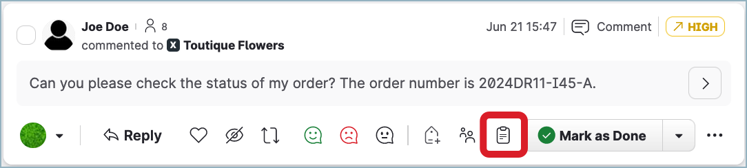You can add an emoji or attach an asset (for example, a photo) to the message. You can also use answer templates to insert frequently used standard phrases such as Hello! Thank you for your message. How can I help you today?(see Set Up Answer Templates for Community).