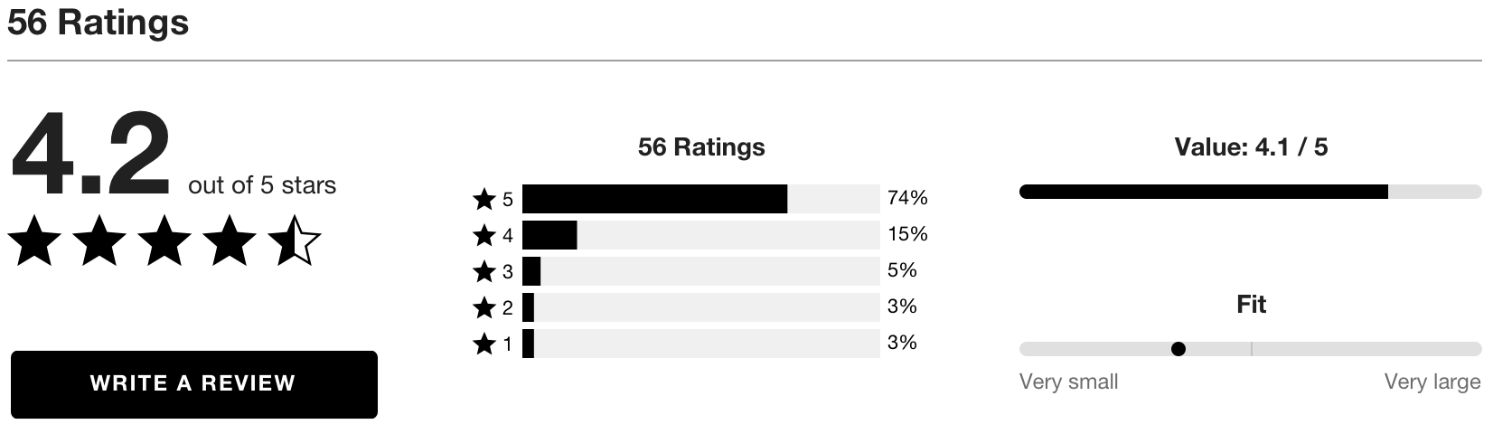 The Reviews Summary widget offers a visual aggregation of all the Emplifi Ratings & Review data collected for your product, along with a button allowing shoppers to submit their own review. It is usually displayed either directly above or in some cases directly to the left of the Review List widget.