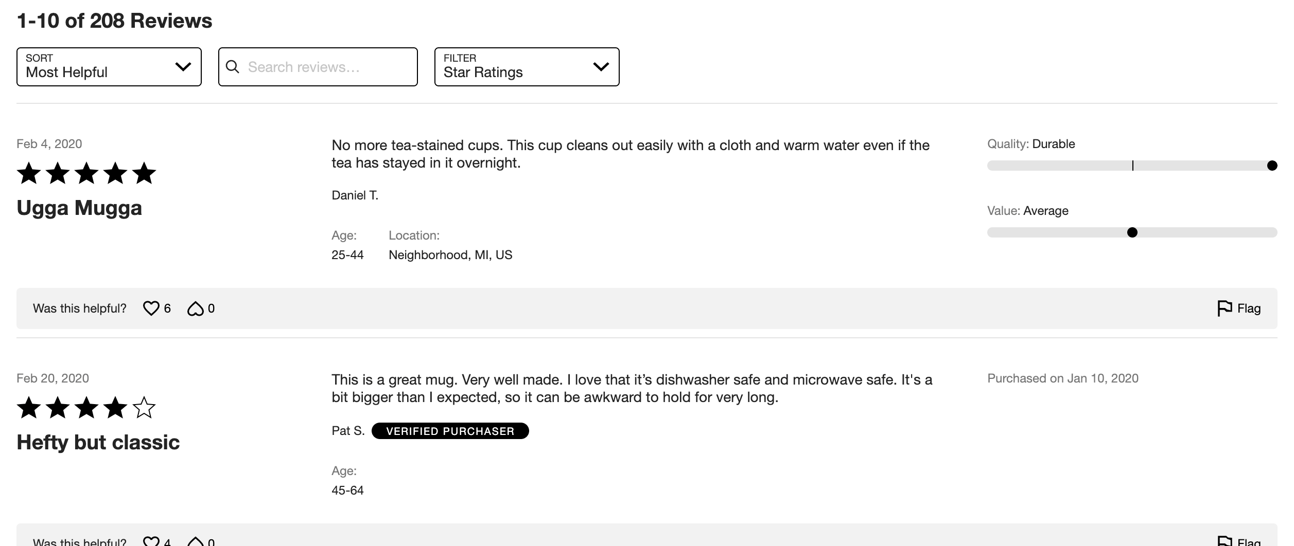 Most customers choose to display the Review List widget directly below the Reviews Summary widget.