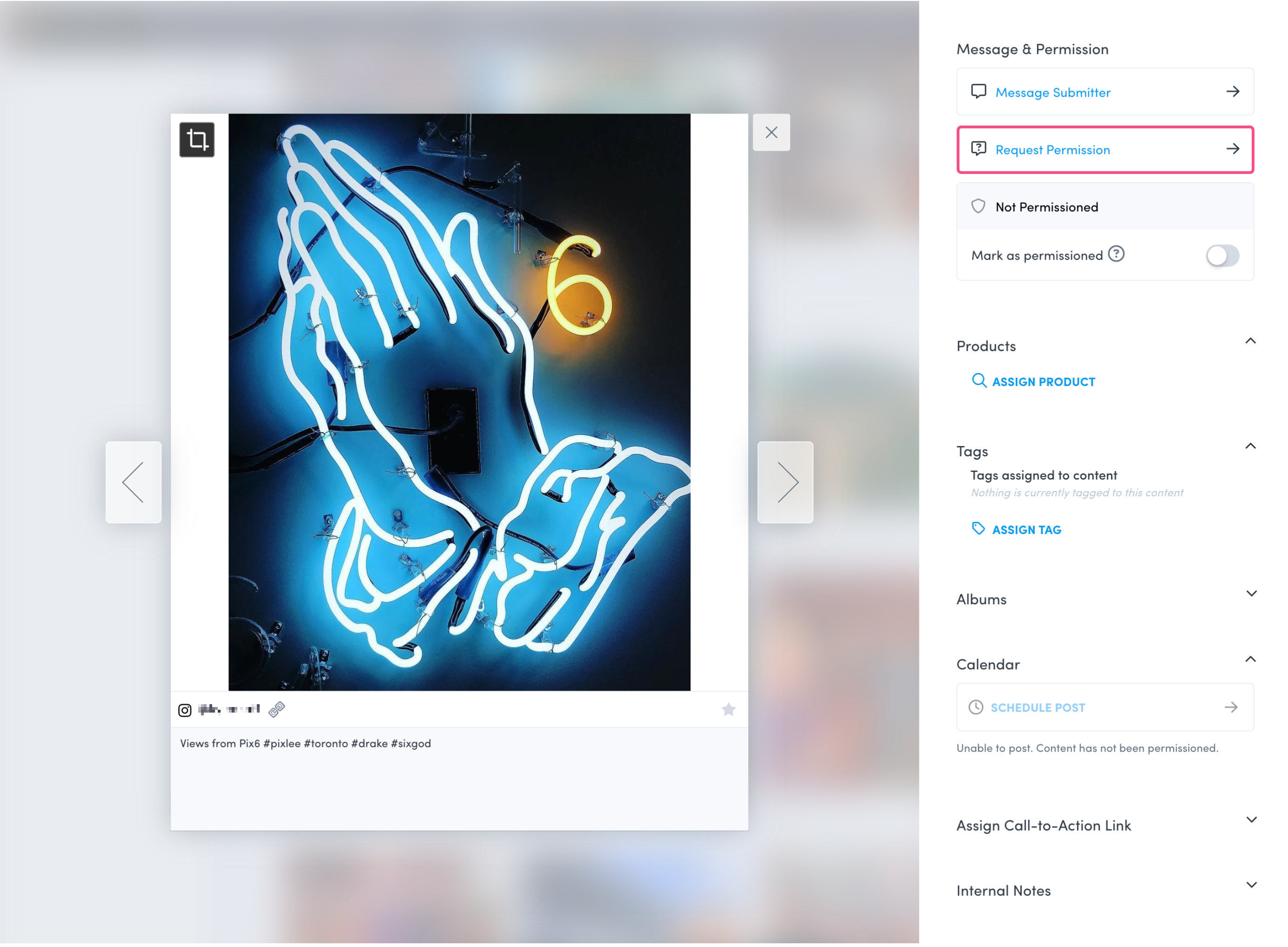 Once the Permission Request for content lightbox opens, your choices will depend on the social network the content was collected from.