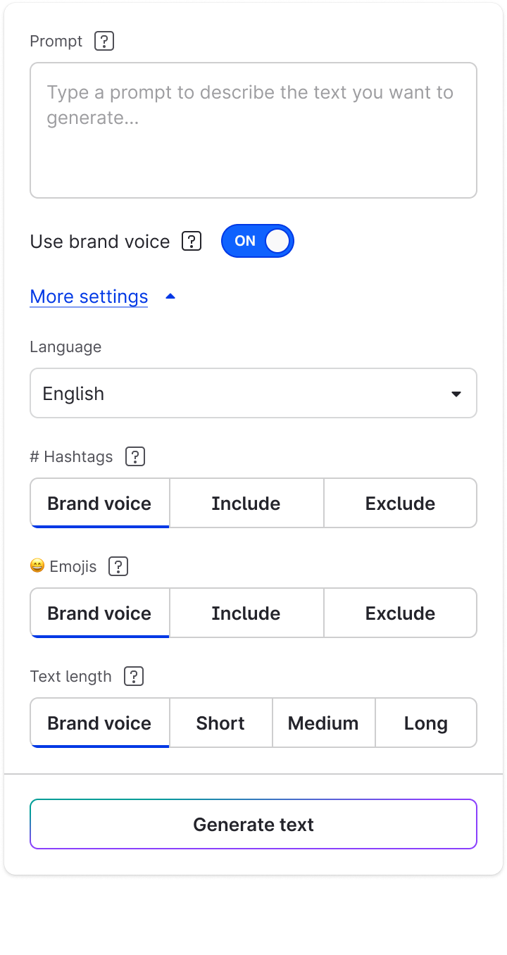 Provide AI Composer with a prompt and choose to generate text in the system-analyzed brand voice, or customize the output by adjusting hashtags, emojis, or text length.