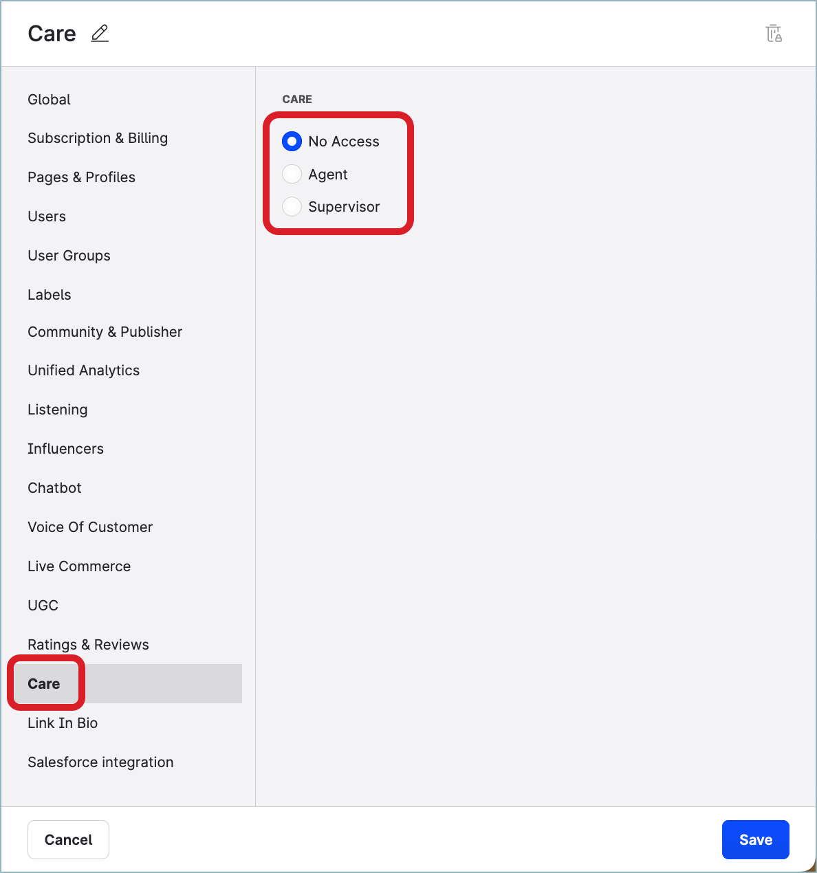 Control who in your Emplifi account can access and use Care and Salesforce integration. To do so, create an account role (see Account Roles) with the required level of access to Care and Salesforce and assign it to the users who are going to work with Care and Salesforce integration.