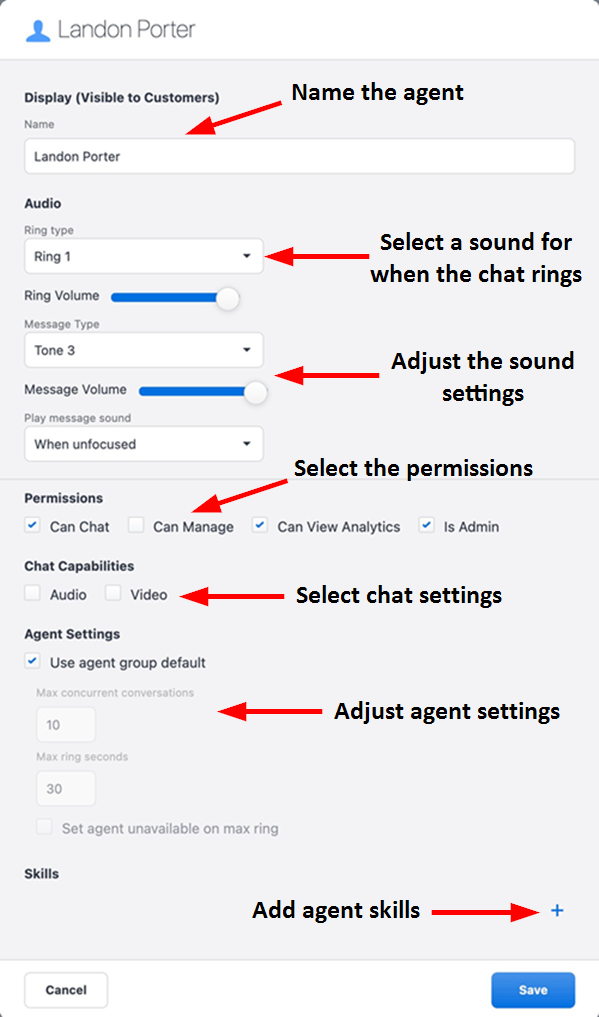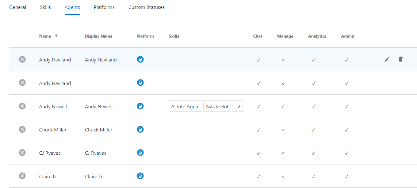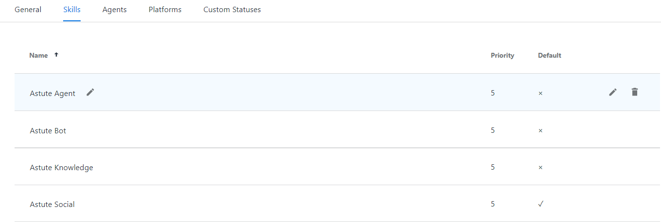 You can use the Skills tab to configure the skills available to the Agent Group. Skills route the chats to the appropriate agents.
