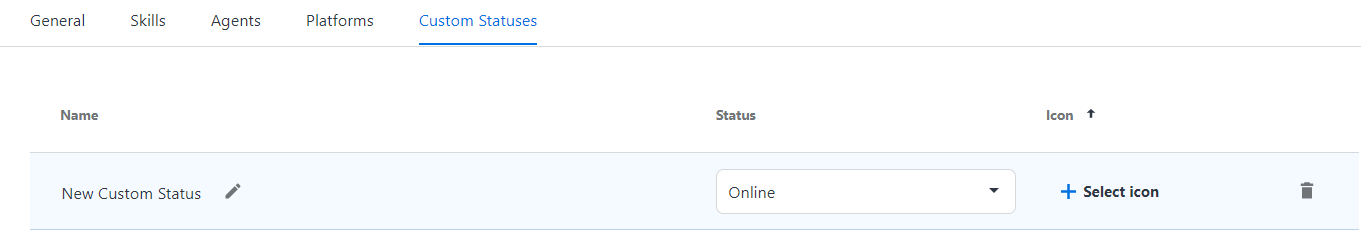 Administrators can use the Custom Statuses tab to configure custom away statuses with associated icons for their agents. These statuses appear as options in the "Set Agent Status on Max Ring" drop-down menu on the General tab.