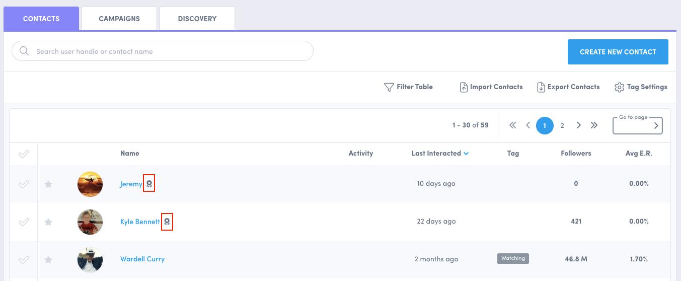 As influencers signup, they will be added to your Contacts list with a creator badge where you can then see their profile, view their analytics & past post-performance, and see if they are the right influencer for your brand. Once they are a part of your contacts, you can remove them from
