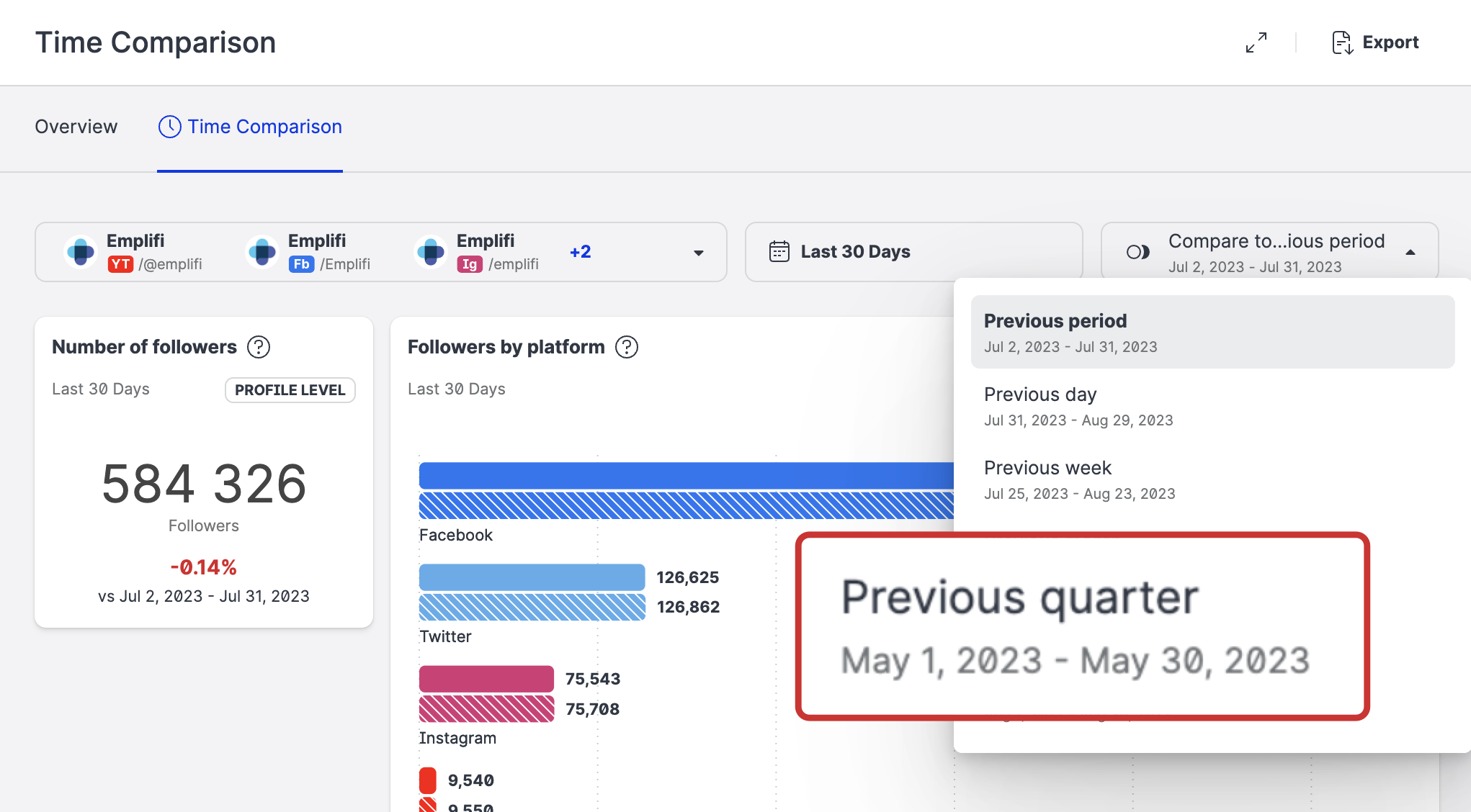 The actual dates are always specified in the user interface. In the following example, the last 30 days period is August 1, 2023 - August 30, 2023 and it is compared to the same period a quarter ago (May 1, 2023 - May 30, 2023).