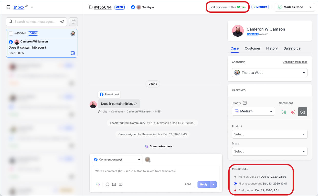 Each case that has an SLA policy assigned contain information about the SLA policy, its milestones, and timestamps. This information can help Care agents and supervisors understand the progress of the case and quickly identify what the past, current, and future milestones are and whether the milestones were breached or completed on time.