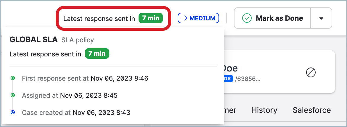 Highlighted in green, if the “Total resolution time” milestone is enabled in the SLA policy assigned to the case and the milestone was completed on time