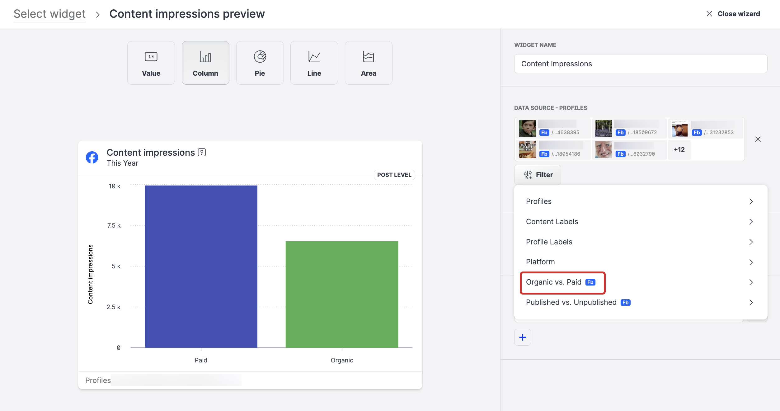 You can easily display and review the impact of your promoted content by using the Organic vs Paid option in the Breakdown and Filter menus when you are designing your widget.