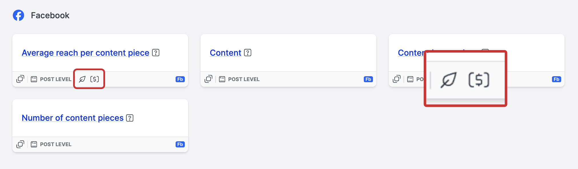 The availability of the organic vs boosted/paid split in individual widget is indicated by additional icons: