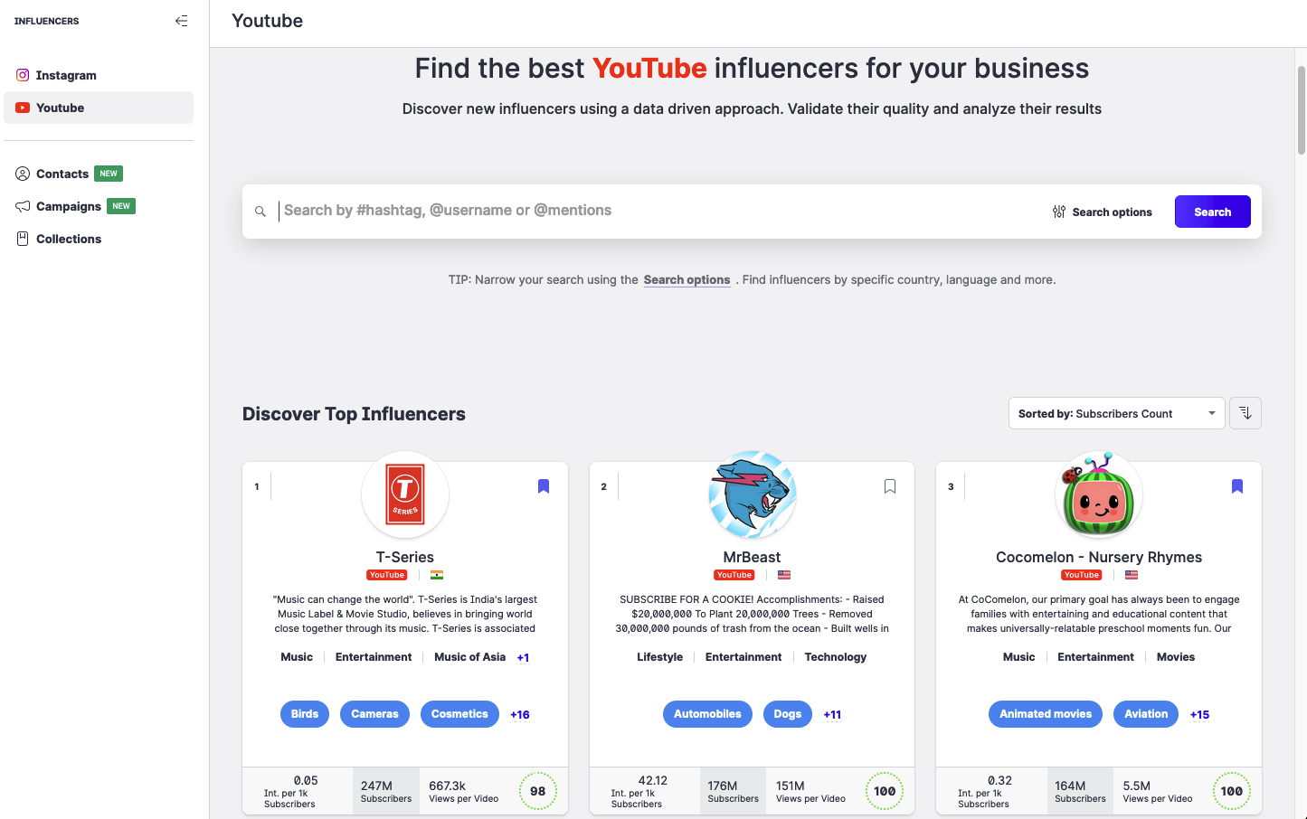 Search our Youtube influencer database by number of subscribers, interests, country, and Youtube category to match influencers to your audiences and fulfill your unique objectives. You can also filter by the average video length and posting frequency. Or, you can browse our list of top Youtube channels to see who is trending.